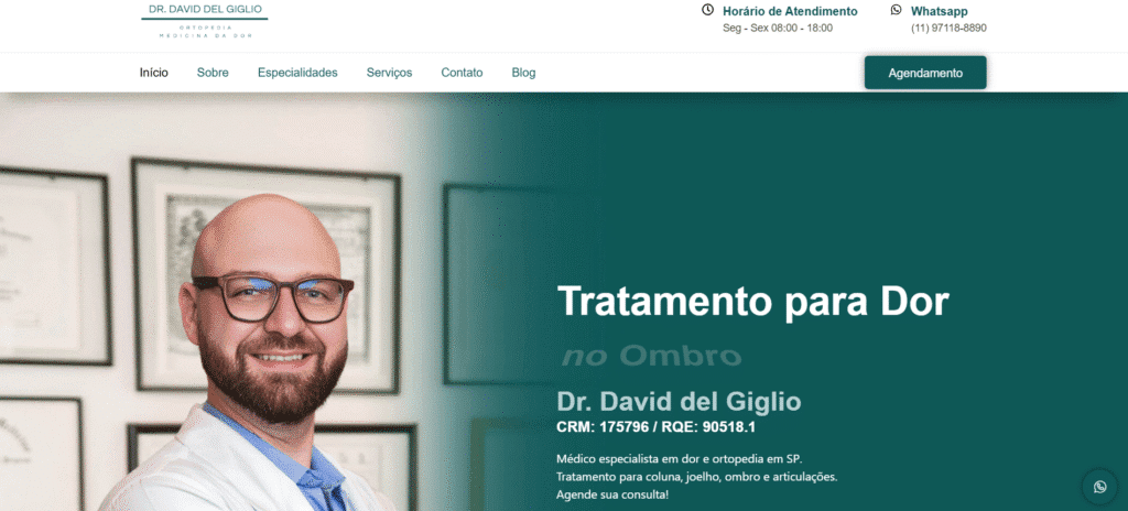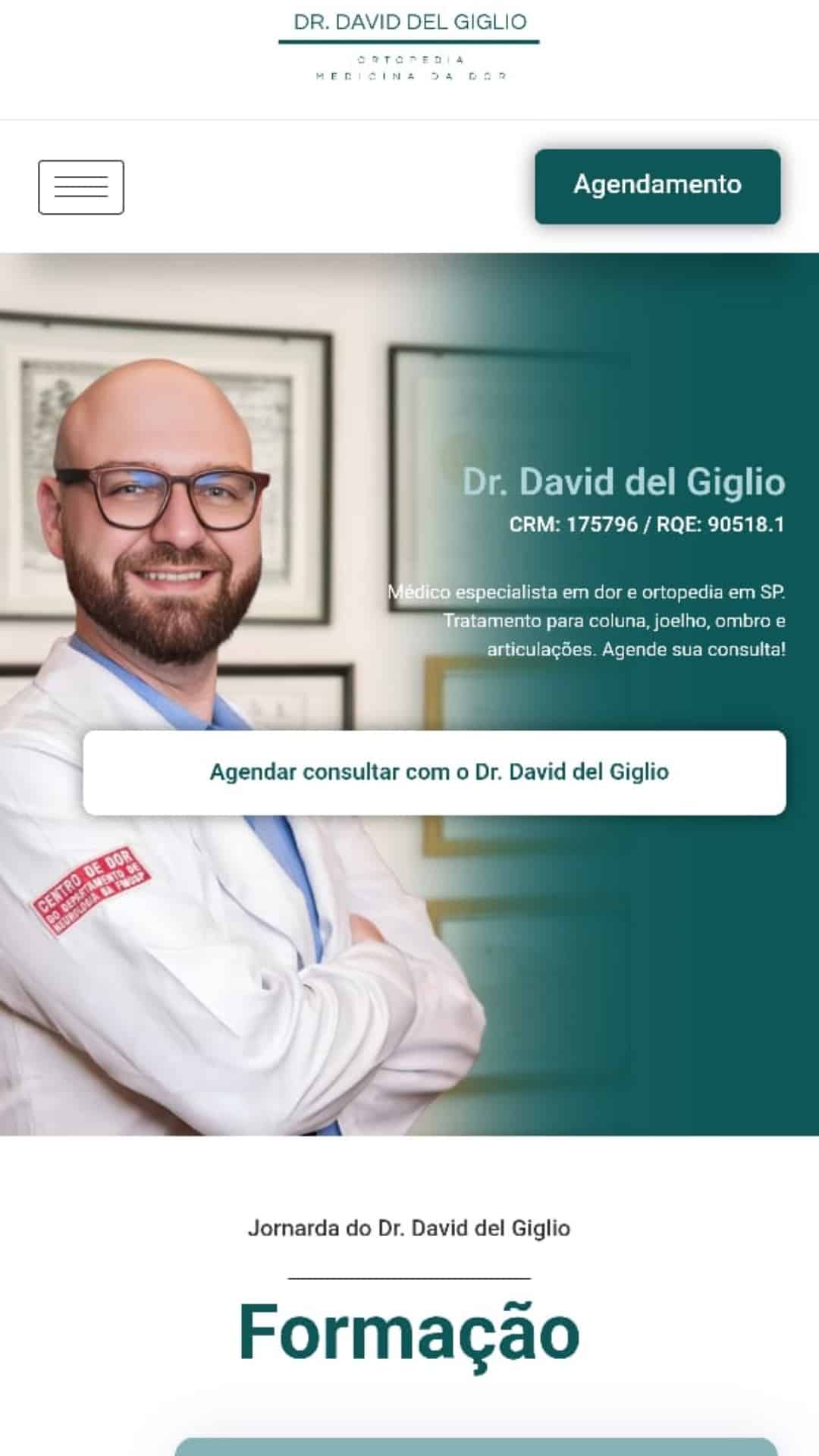 O Dr. David del Giglio, médico especialista em dores na coluna, ombro, articulações e joelhos, buscava expandir sua atuação e alcançar mais pacientes. Seu objetivo era otimizar a presença digital para além de um site funcional, transformando-a em uma ferramenta estratégica para captação de leads qualificados e construção de autoridade, especialmente no ambiente online competitivo de São Paulo. Era crucial destacar sua vasta experiência (mais de 10 anos, 20 mil atendimentos e 500 cirurgias) e as diversas soluções de tratamento que oferece, desde procedimentos minimamente invasivos até medicina regenerativa.